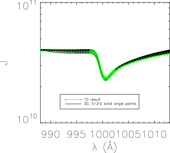 to test the accuracy of the formal solution by comparing to the results of the 1D code. The 1D solver uses 64 radial points, distributed logarithmically in optical depth. Comparing the line mean intensities