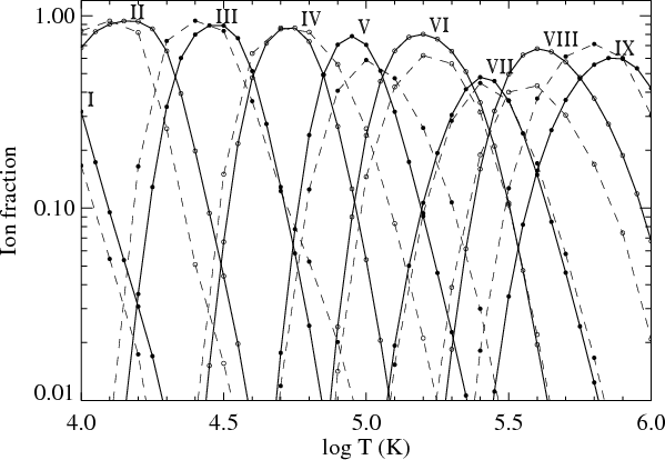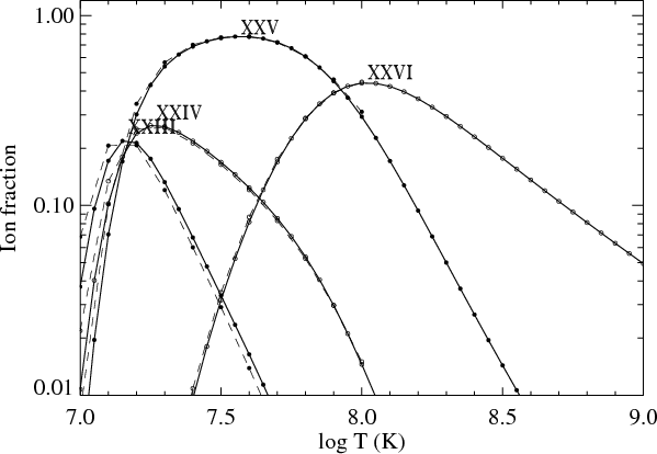For other elements, there are often several ions with notable differences. In general, the differences between our ionization equilibria and those of Mazzotta et al. (1998) must be attributed to the combined effect of updated ionization and recombination rates. It would be useful to the user of these data to examine them for the particular ions in which they are interested.