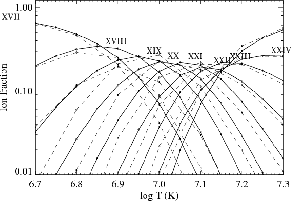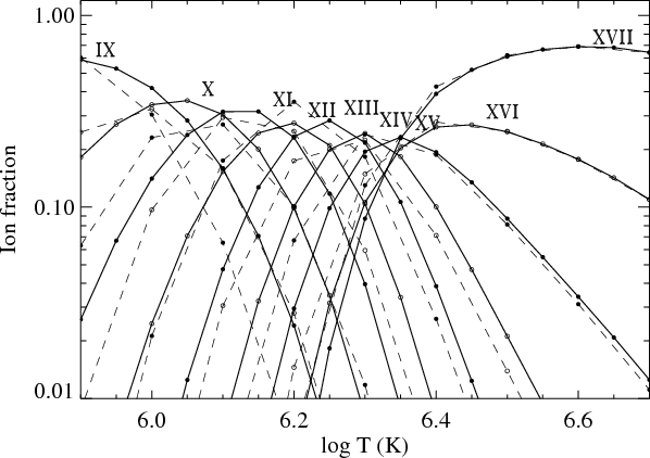 In Figs. 1-4, our present ionization equilibrium calculations for iron are displayed, together with those of Mazzotta et al. (1998). In general, the differences are not large but there are a few cases where there is noticeable disagreement. In Fig. 1 the ionization equilibria for Fe II, III, V, VI, VIII AND IX show considerable differences. For the ions Fe X-XXI, the temperatures at which the current maximum ion fraction is found is typically a factor of 0. to 0.1 higher in