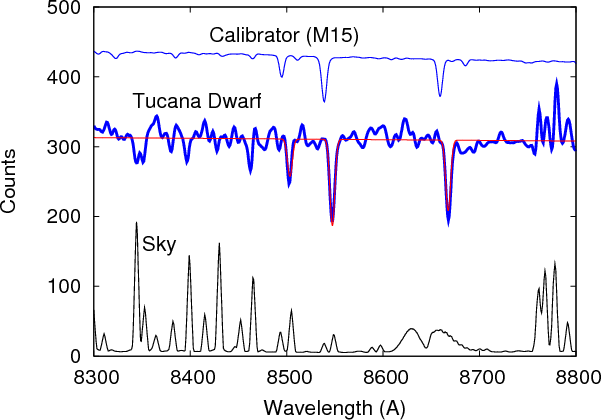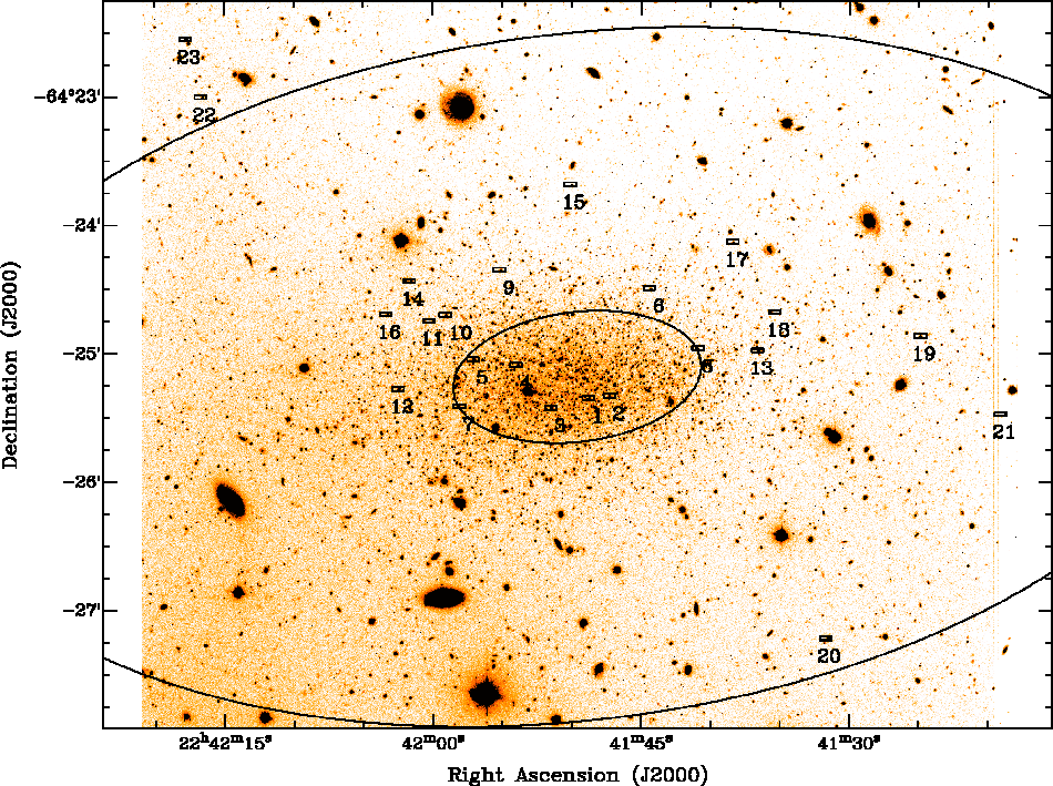 2 kpc) centred on Tucana. Out of the 45 slits, 30 were located on positions of stars selected to lie on the RGB in the CMD (see Fig. 2), and the remaining targets were randomly selected to fill otherwise empty slits. The spatial size of each slit is