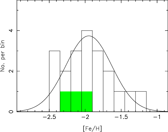 iii) All the stars that we observed have low metallicity with a mean value of [Fe/H]= -1.95 and a dispersion of 0.32 dex.