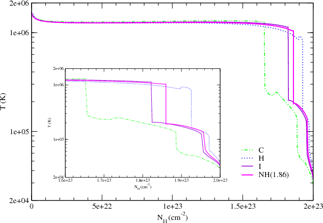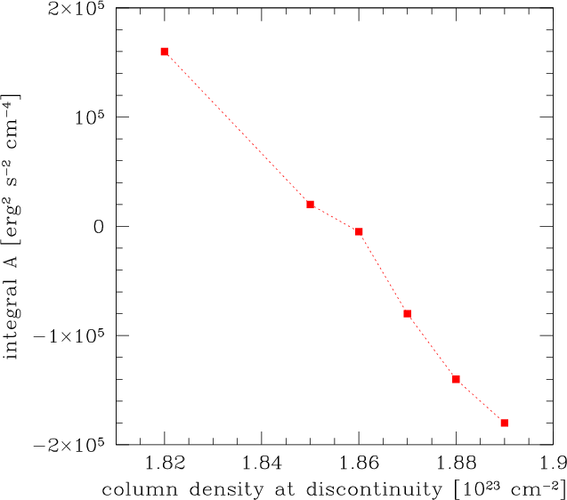 It is interesting to note that finding the exact location of the discontinuity in the model also provides a solution to some numerical problems that are met in TITAN used in the second (nonstandard) operational mode, used in Paper I. If we attempt to determine the type H state of the cloud (i.e. we always choose the hottest solution in the multiple solution region; see Sect. 2), we actually face the problem of the small regular oscillations in the state properties, which translate into the small but finite oscillations in the total energy balance of the cloud. To illustrate this we present in Fig. B.1 the dependence of our estimator of convergence on the number of iterations for different states. The oscillations in total energy balance correspond to the oscillations in the location of the main temperature drop (see Fig. 1).