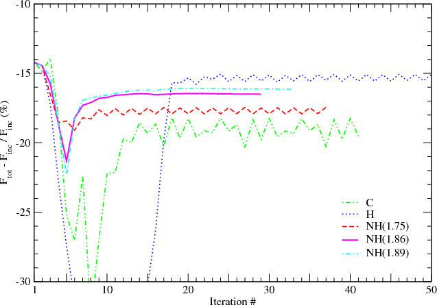 Figure B.1: The convergence properties of our reference cloud as a function of the iteration number up to iteration 50, for the states H (no change up to iteration 65) C, and NH(1.86). |