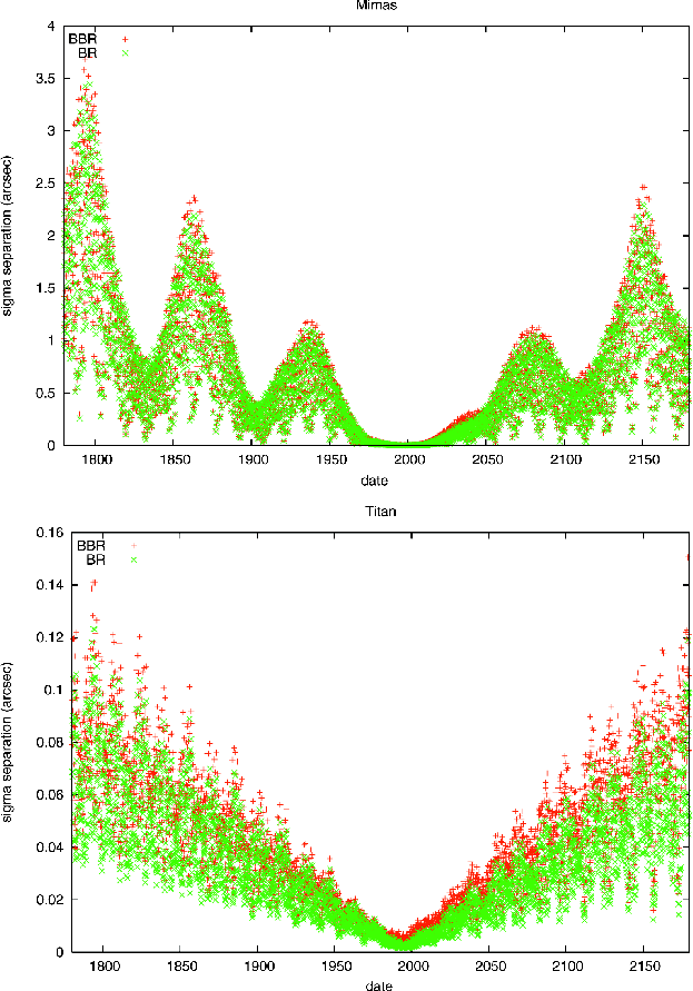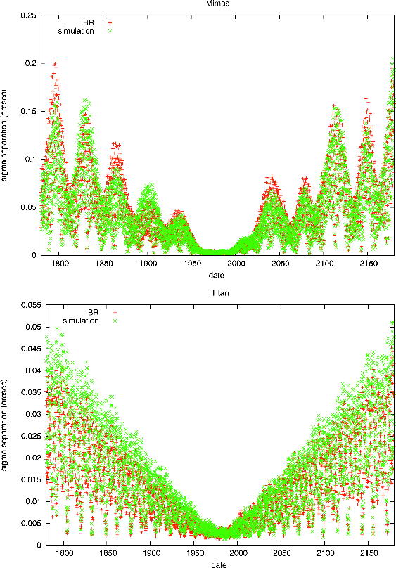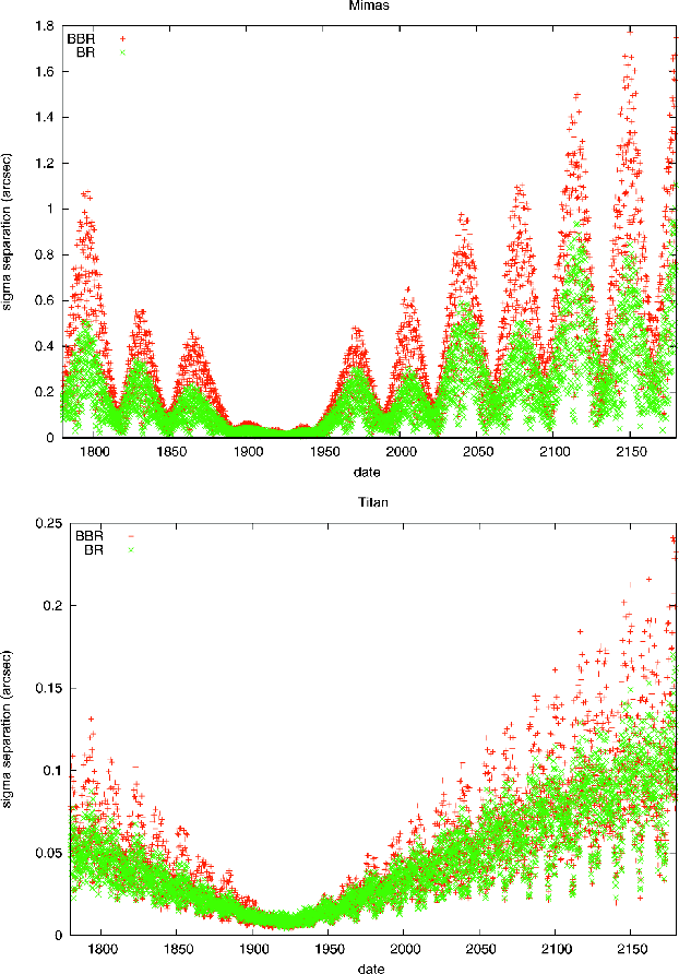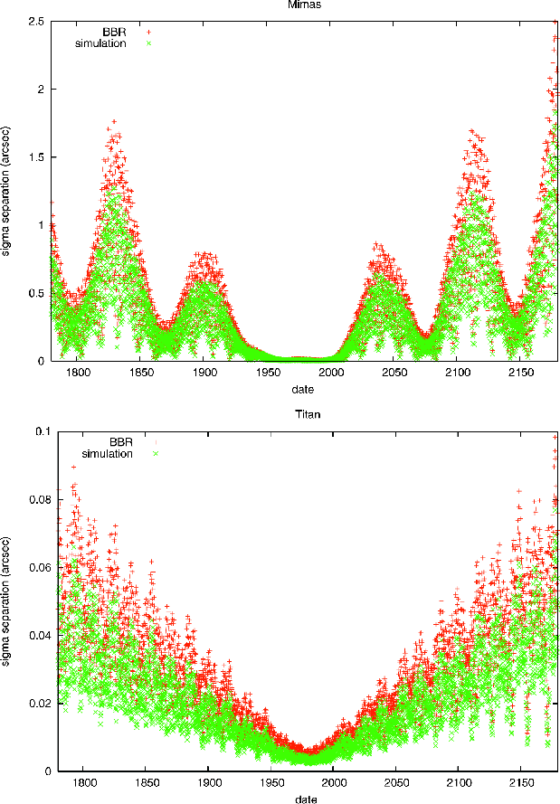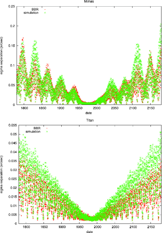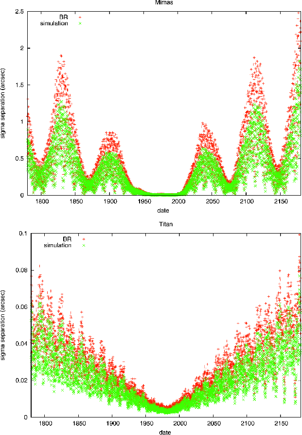 Figure 10: Extrapolated standard deviation of positions for Mimas and Titan after fitting to recent observations (1961-2007)with BBR (in red pluses) and BR (in green crosses). |