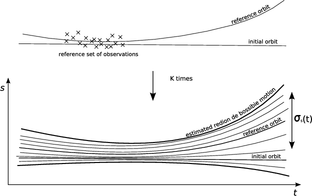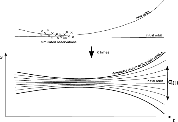 The determination of the region of possible motions using the covariance matrix is probably the most classical method. It consists of simulating orbits using the covariance matrix and LSM solution (Bordovitsyna et al. 2001; Avdyushev & Banshchikova 2007).