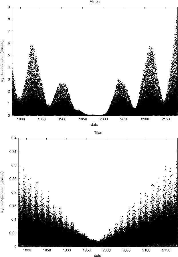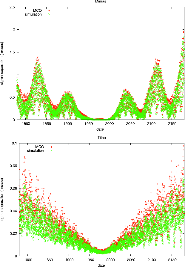 Furthermore, during the observation period, the standard deviation is quite small (about 0.05'' for Mimas and 0.02'' for Titan). Outside this period, the extrapolated standard deviation quickly diverges, particulary for Mimas, and is quite similar to simulations.