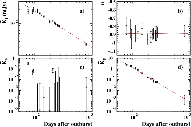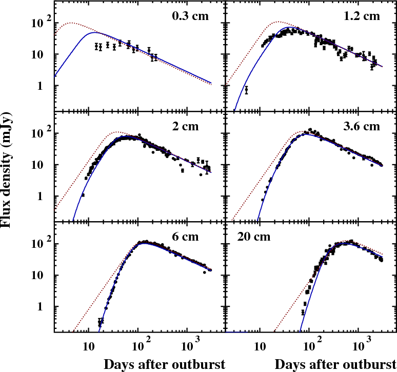 From a fit to early data using the parametrized model of Weiler et al. (1986,2002; see Appendix A), Van Dyk et al. (1994) found for the time dependance of the optical depth