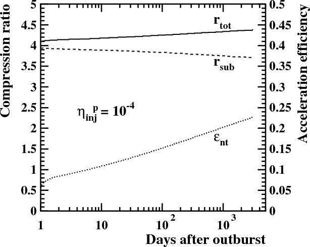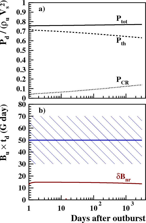 because in these objects an increase in the injection efficiency produces a narrower interaction region (Cassam-Chenaï et al. 2007). This is not the case in SN 1993J because of the much higher magnetic field strength in the shock precursor region, which limits the backreaction of the shock-accelerated nuclei on the shock structure (see Sect. 2.4).