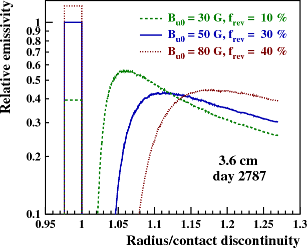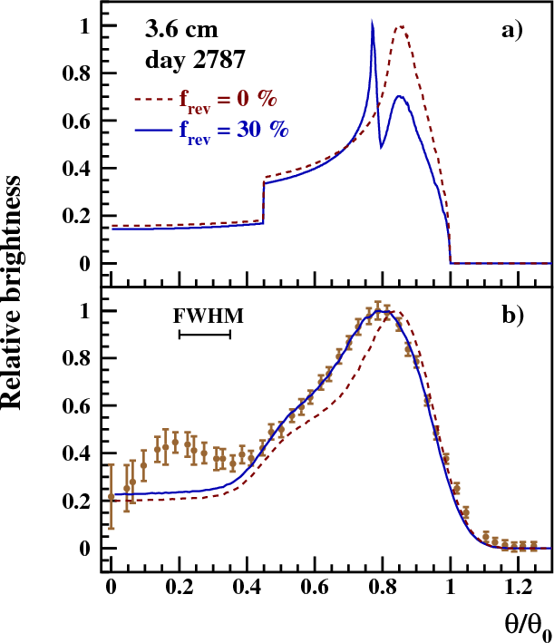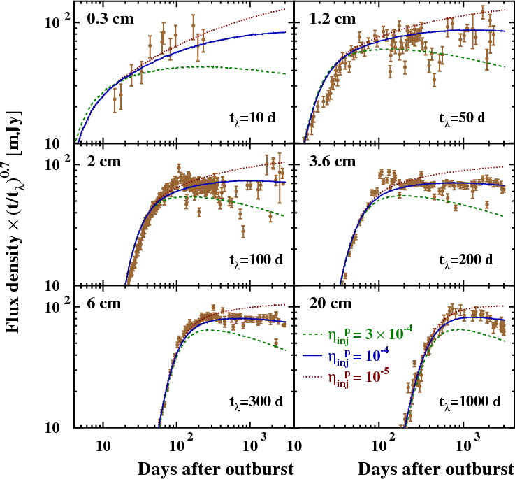 As discussed by Bartel et al. (2002), this result strongly depends on the systematic errors associated with the model of uniform emissivity in the spherical shell. The overall systematic uncertainty was estimated to range from 3% at early epochs to 1% at later epochs and to dominate the statistical error in most of the cases. We show below (Sect. 3.1) that the assumption of uniform emissivity is questionable, because radio-emitting electrons accelerated at the forward shock are expected to lose most of their kinetic energy by radiative losses before reaching the contact discontinuity between shocked ejecta and shocked CSM (see also Fransson & Björnsson 1998). Furthermore, the radial emissivity profile is expected to vary with time and radio frequency