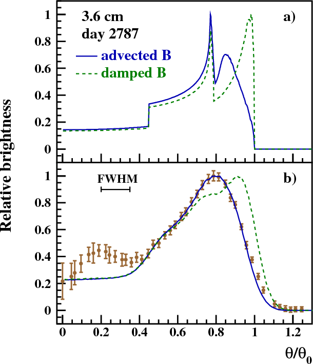 as a function of time by consistently fitting to the two-dimensional radio images observed at 34 epochs between 1993 and 2001 the projection of a three-dimensional spherical shell of uniform volume emissivity. They fixed the ratio of the outer to inner angular radius (as expected from a self-similar expansion) at
