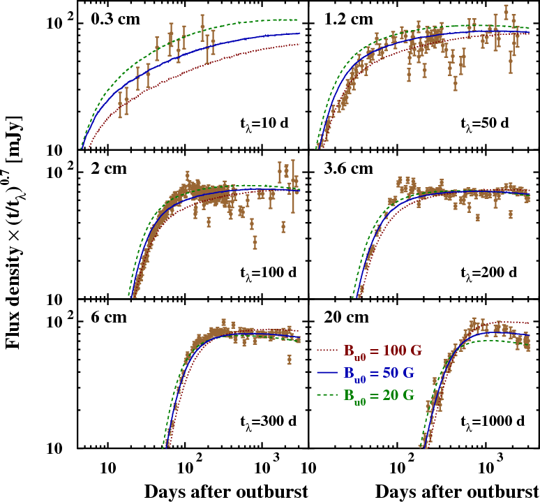 Results. Both the light curves and the morphology of the radio emission indicate that the magnetic field was strongly amplified in the blast wave region shortly after the explosion, possibly via the nonresonant regime of the cosmic-ray streaming instability operating in the shock precursor. The amplified magnetic field immediately upstream from the subshock is determined to be
