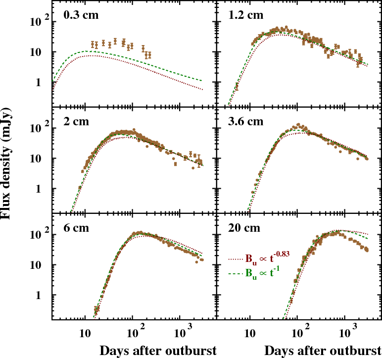 We see in Fig. 2 that the maximum intensity is reached first at lower wavelengths and later at higher wavelengths, which is characteristic of absorption processes. For SN 1993J, both free-free absorption (FFA) in the CSM and synchrotron self-absorption (SSA) are important (Chevalier 1998; Fransson & Björnsson 1998; Weiler et al. 2007). The Razin effect can be excluded (Fransson & Björnsson 1998). FFA is produced in the stellar wind that has been heated and ionized by radiation from the shock breakout. If the circumstellar gas is homogeneous and of uniform temperature
