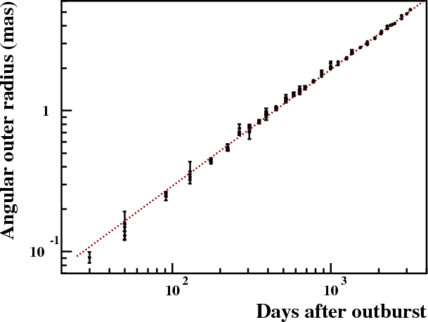 However, Bartel et al. (2000,2002) found significant changes with time of the parameter m, indicating deviations from a self-similar expansion. These authors determined the outer angular radius