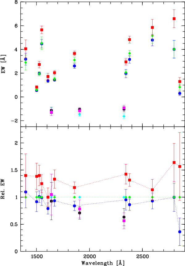 m, where the emission is dominated by polycyclic aromatic hydrocarbons (also products of AGB stars). In addition, they exhibit larger equivalent widths for prominent UV (metal) absorption features, mostly of interstellar origin, which indicates overall more evolved stellar populations.