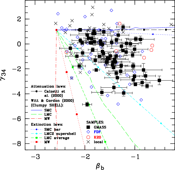 A broad absorption excess centred on 2175 Å (the so-called ``UV bump'') characterises the extinction curves usually inferred for sightlines towards the Milky Way (MW) and Large Magellanic Cloud (LMC) (for reviews see Fitzpatrick 2004; and Clayton 2004), and also towards M 31 (Bianchi et al. 1996). In contrast, this feature is absent in the typical extinction curves of the Small Magellanic Cloud (SMC), which exhibit a steep rise at far-UV wavelengths. SMC-like dust appears to characterise starburst galaxies in the local Universe (Calzetti et al. 1994) and Lyman break galaxies (LBGs) at redshifts 2 < z < 4 (Vijh et al. 2003). For this reason, the so-called ``Calzetti law'' (Calzetti et al. 1994, 2000) is frequently assumed to describe attenuation by dust in starburst and star-forming galaxies in the distant Universe.