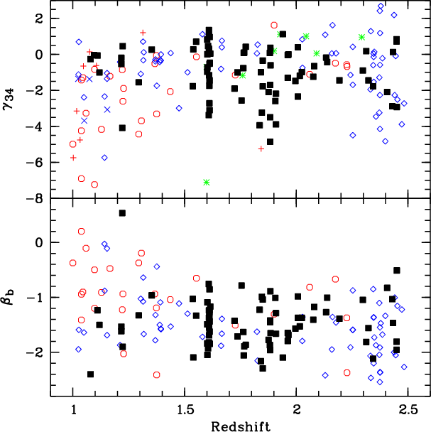 However, there is strong support for the presence of the 2175 Å feature in spectra of at least 30% of the vigorously star-forming galaxies at 2 < z < 2.5 (Noll & Pierini NP05, hereafter referred to as NP05) and 1 < z < 1.5 (Noll et al. NPPS, hereafter referred to as NPPS). Furthermore, an LMC-like extinction curve with a UV bump was inferred clearly from both the spectrum and the broad-band spectral energy distribution (SED) of the afterglow of the gamma ray burst GRB 070802 at z = 2.45 (Fynbo et al. 2007; Krühler et al. 2008; Elíasdóttir et al. 2008). As for other objects at intermediate/high redshifts, the presence of the carriers of the 2175 Å feature is controversial in quasars/active galactic nuclei (AGN) (cf. Pitman et al. 2000; Maiolino et al. 2001; Hopkins et al. 2004; Vernet et al. 2001) and intervening Mg II absorbers (Malhotra 1997; Wang et al. 2004; Vanden Berk et al. 2008), whereas it is likely in Ca II absorbers at intermediate redshifts (Wild & Hewett 2005).