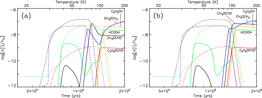 In the case of hot cores, the granular ice mantles built up during prior phases of evolution present a rich source of simple saturated molecules from which more complex species may form, as has long been realized (Millar et al. 1991). However, while the efficiency of complex molecule formation in the gas phase is limited (not exclusively) by the need to stabilize the energized complex, often resulting in fragmentation, adhesion to a grain surface allows an adduct to quickly thermalize. Thus, molecular radicals derived from the ice mantles may combine in situ on the grain surfaces to build up complex structures efficiently, if dust temperatures are sufficient for the reactants to meet by thermal diffusion. The hot-core models of Garrod & Herbst (2006) and Garrod et al. (2008) have demonstrated the plausibility of such mechanisms in reproducing observed abundances of many complex organic species.