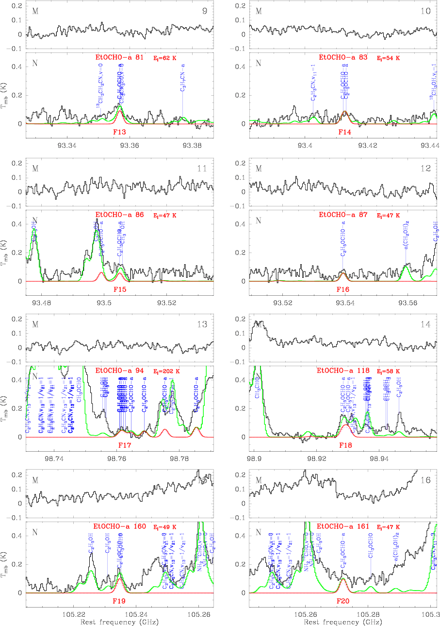 Transitions of the anti-conformer of ethyl formate (EtOCHO-a) detected with the IRAM 30 m telescope. Each panel consists of two plots and is labeled in black in the upper right corner. The lower plot shows in black the spectrum obtained toward Sgr B2(N) in main-beam brightness temperature scale (K), while the upper plot shows the spectrum toward Sgr B2(M). The rest frequency axis is labeled in GHz. The systemic velocities assumed for Sgr B2(N) and (M) are 64 and 62 km s-1, respectively. The lines identified in the Sgr B2(N) spectrum are labeled in blue. The top red label indicates the EtOCHO-a transition centered in each plot (numbered like in Col. 1 of Table 3), along with the energy of its lower level in K (