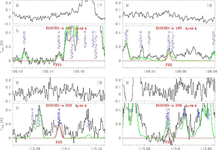 86.9787 GHz as two transitions of the anti-conformer of ethyl formate, the second one with two velocity components. However, our model predicts a peak temperature of the ethyl formate