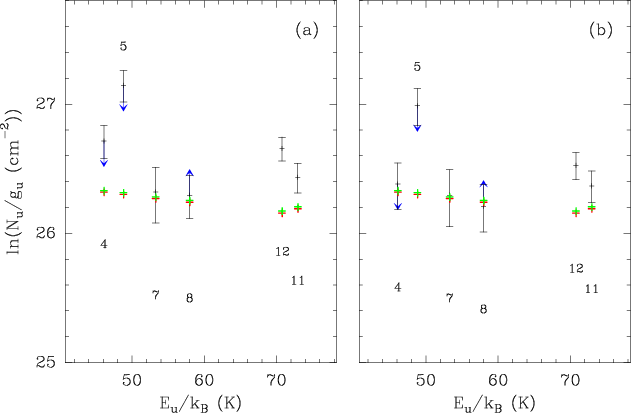 a- and b-type lines are well fitted with the same physical model (see Table 5). Although many a-type transitions with