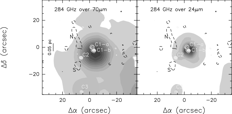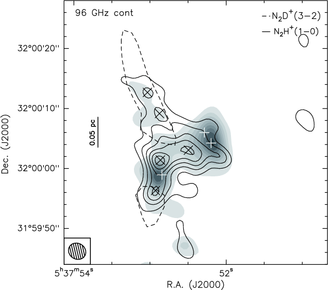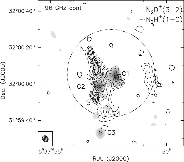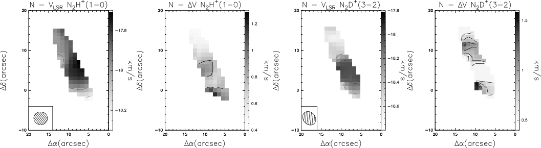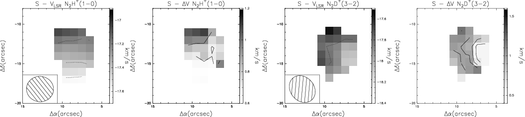 0.5-1.5 km s-1) towards N and S, indicating that the gas in the deuterated condensations is more quiescent than that associated with the continuum sources. This is consistent with the fact that they are still in the pre-stellar phase and hence the star formation process has not yet taken place there.