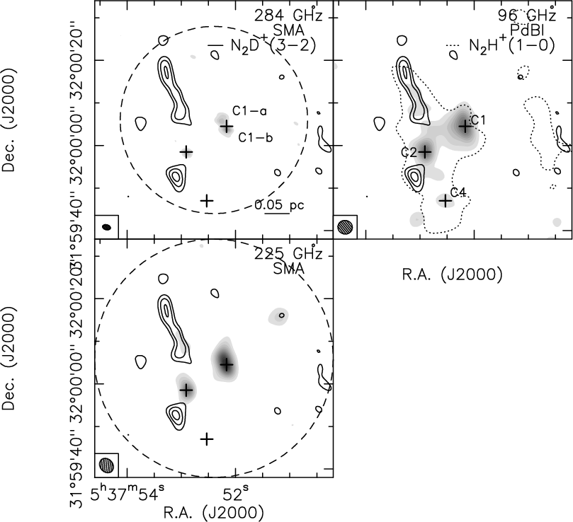 Methods. We performed millimeter high-angular resolution observations, both in the continuum and several molecular lines, with the PdBI and the SMA. In a recent paper, we published part of these data. The main finding of that work was the detection of two cold and dense gaseous condensations, called N and S (masses