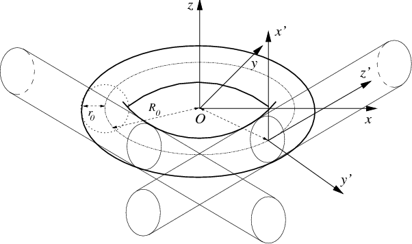 and z centered on the symmetry point O of the toroid and with the