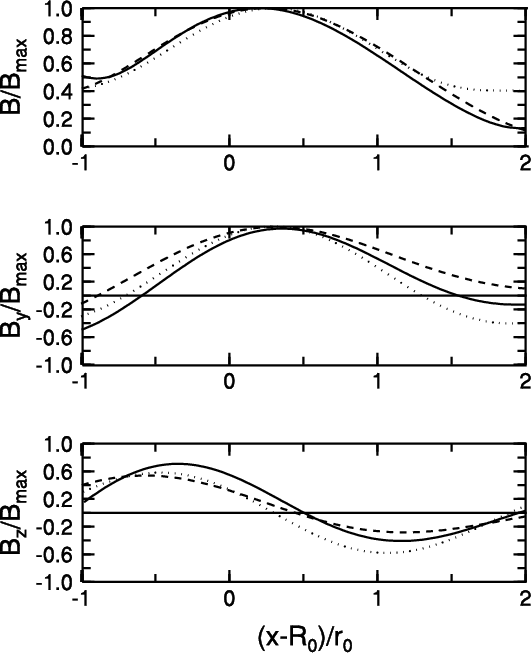 Figure 3: Profiles of the magnetic field magnitude B and magnetic field components By and Bz through the flux ropes shown in Fig. 2. They are profiles along the x-axis, the solid line is for the flux rope with R0/r0 = 2 and the dashed line for R0/r0 = 4. The dotted line shows the Lundquist solution for comparison. The Bx component is not displayed because it is zero for all the cases. The profiles are scaled by the respective maximum value of B in the plot. |