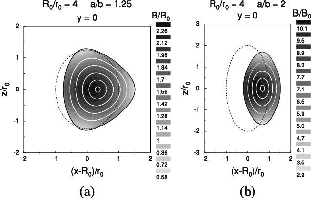 Figure 4: Magnetic field distribution and field lines of toroidal flux ropes. The figures show cross sections through two flux ropes. The layout is the same as in Fig. 2. The dashed ellipses are cross sections of generating toroids with aspect ratios/oblatenesses of 4/1.25 a) and 4/2 b). |