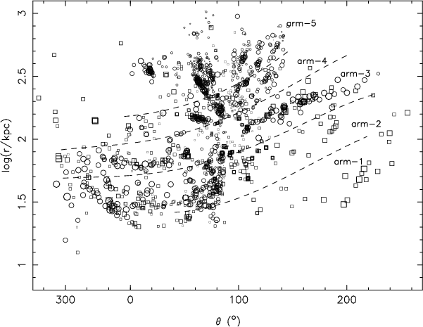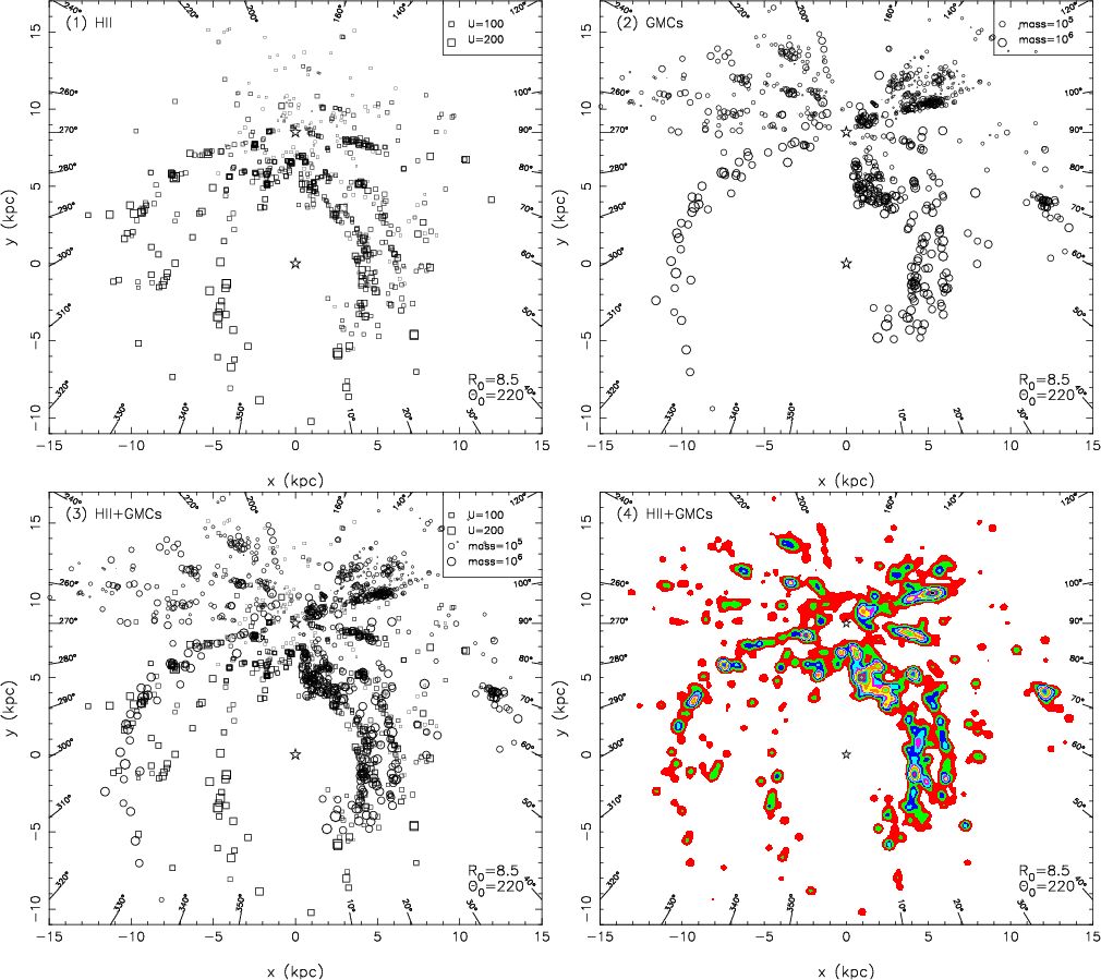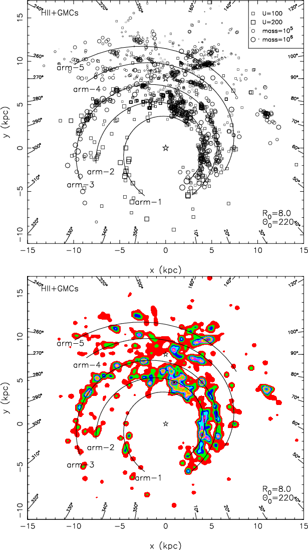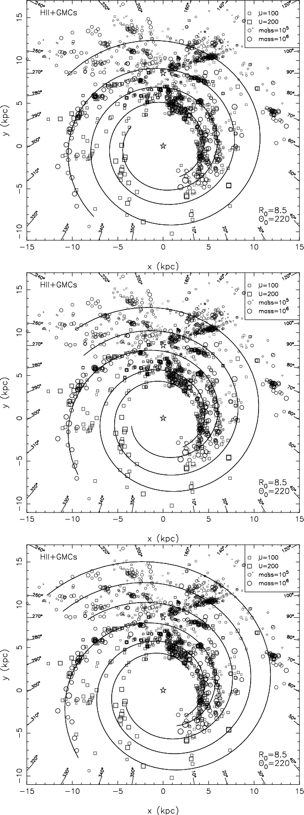 should have a larger value of weight. For the HII regions, we take the weighting parameter B = U/(100 pc cm-2), so that an HII region with U = 100 pc cm-2 has a weight of 1 in the determination of the spiral pattern, while an HII region with U = 200 pc cm-2 has a weight of 2. For the GMCs, the weighting parameter is taken to be