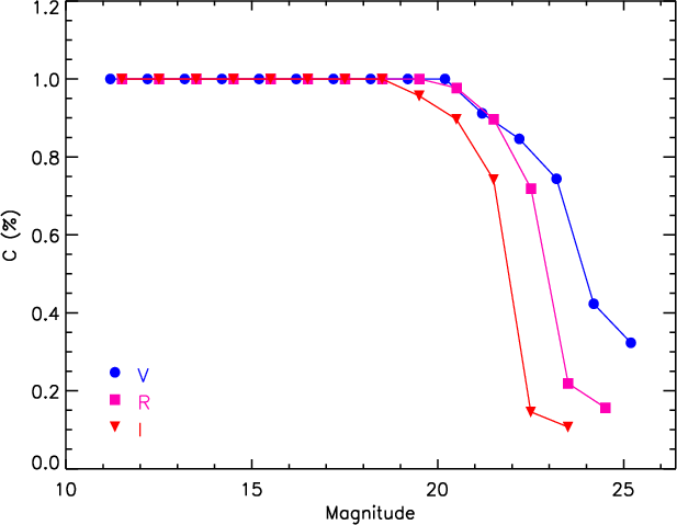 square arcmin area in IC 2391 using the wide-field imager at the ESO 2.2 m telescope. The completeness limits of the photometry at the 3