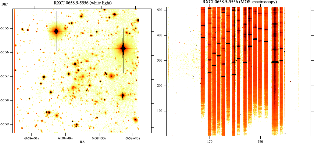 Figure 2: Example of a direct image and spectral lay-out for a cluster observed in MOS mode with EFOSC-1 at the 3.6 m telescope. Left: direct image in white light of RXCJ0658.5-5556, a luminous REFLEX cluster at z=0.2965 (see also Fig. 4). Right: the resulting MOS frame, showing the set of two-dimensional spectra corresponding to each target galaxy in the mask. The dispersion runs along the vertical direction. Each strip shows the sky spectrum (dark horizontal lines) together with the fainter galaxy spectrum. |