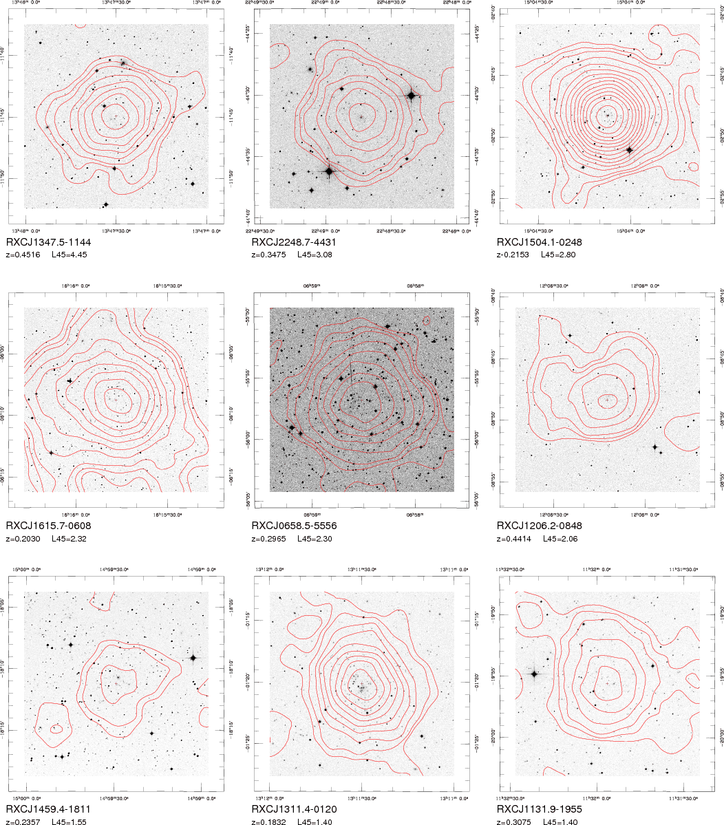 10-12 erg s-1 cm-2 for extended sources) and the depth of the only wide-area optical imaging available at the time, i.e. the Palomar and in particular the southern UK-Schmidt sky surveys. These early X-ray samples included surveys like Hydra (Pierre et al. 1994), SGP (Romer et al. 1994; Cruddace et al. 2002, 2003), XBACS (Ebeling et al. 1996), BCS (Ebeling et al. 1998, 2000), RASS-BS (De Grandi et al. 1999),