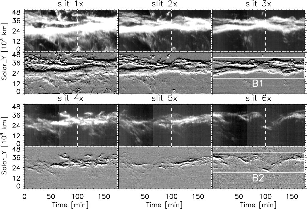 Figure 3: As in Fig. 2, but space-time slices along the horizontal slits of 1x-6x in Fig. 1. Both intensity and its space-derivative (along solar Y axis from bottom (north) to top (south)) at each slit are shown. The space-derivative in the boxes of ``B1'' and ``B2'' are shown in Fig. 4. |