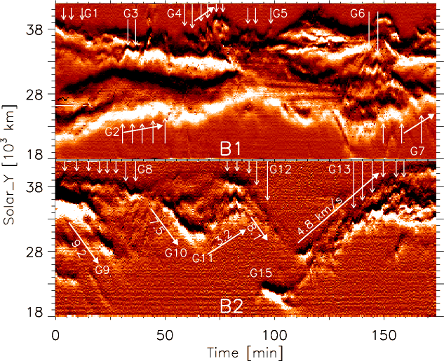 These three threads oscillate with an average period of 330 s, which is a little longer than that of horizontally oscillating motions. Both G14 and G15 threads are drifting upward simultaneously. Several threads drift upward as quickly as 24 km s-1 at slit 4y in Fig. 2. We find that the oscillating threads are drifting downward, especially at slit 2y in Fig. 2, with a velocity of 2.3 km s-1. By comparing Figs. 4B2 with 5A1, we find
