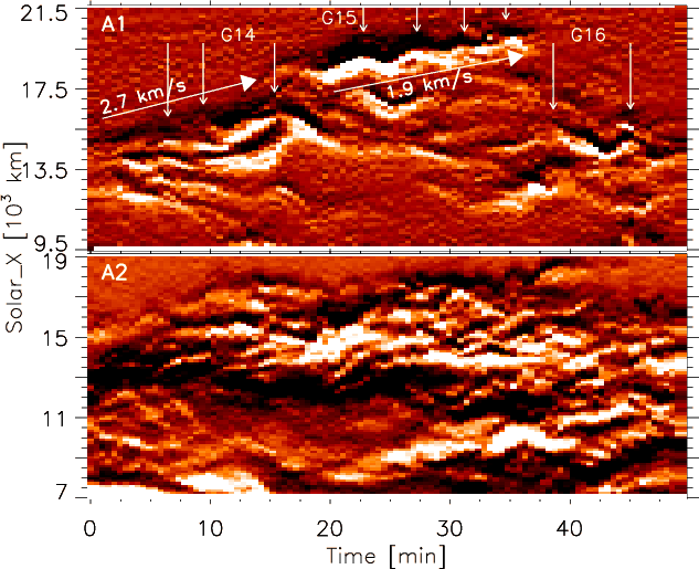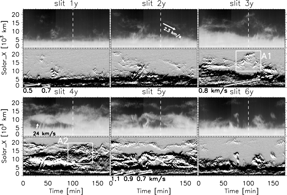 Figure 2: Space-time slices along the vertical slits of 1y-6y in Fig. 1. Both intensity and its gradient along solar X axis from bottom (close the solar surface) to top at each slit are shown. The two-dimensional image at the time indicated by the dashed line is shown in Fig. 1. Six upflows are identified at the slits 1y, 3y, and 5y. White arrows at slits 2y and 4y point out the downward and upward drifting structures, respectively (see text for details). The numbers show the speed values. The space-derivative in the boxes of ``A1'' and ``A2'' is shown in Fig. 5. |