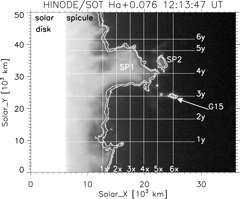 106 km2 and a maximum height of 18 000 km. On the other hand, SP1 had barbs embedded in spicules, while SP2 was suspended in the atmosphere in the time window of our observations. To investigate oscillatory behaviors in the vertical and horizontal directions, we used six slits to get time slices in each direction, such as solids lines marked by from 1y to 6y, or 1x to 6x in Fig. 1. These slits work simultaneously. Thus, we could detect the oscillatory behavior at the same position, but in different directions. All images were aligned using the solar limb prior to making the time slices.