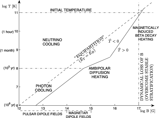 Of course, the specific entropy s and the proton fraction Y are not perfectly conserved quantities within each fluid element, but can be changed by dissipative processes, discussed in Sect. 3: in the case of s, through heat diffusion (Parker 1974), in the case of Y, by (direct or inverse) beta decays or by ambipolar diffusion (motion of charged relative to neutral particles, Thompson & Duncan 1996; Hoyos et al. 2008; Pethick 1992; Goldreich & Reisenegger 1992). Thus, the condition of stable stratification, and with it the hypothetically associated stable magnetic equilibrium configuration, although excellent approximations on short (Alfvén-like) time scales, are eroded on the time scales of the dissipative processes mentioned above, leading to the decay of these structures (Goldreich & Reisenegger 1992), and perhaps to a sudden loss of stability (Braithwaite & Spruit 2006; Braithwaite & Nordlund 2006; Braithwaite & Spruit 2004). In main-sequence stars, white dwarfs, and weakly magnetized neutron stars, these appear to be too long to act on the stellar life time, but in strongly magnetized neutron stars their time scales become shorter, so they might plausibly drive magnetic field decay, leading to internal heating and to the magnetar phenomenon (Arras et al. 2004; Thompson & Duncan 1996).