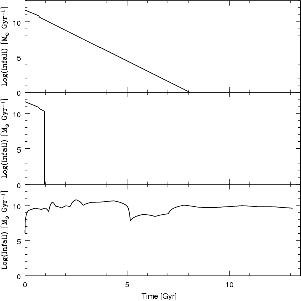 Figure 1 shows the infall laws for all the models as a function of time. The infall law of Model 1 and 2 has a peak at high redshift, and lasts for 1 Gyr. The infall law of Model 2 becomes zero after the peak, since the wind starts. The infall law of Model 3, as we know, is cosmologically derived. It does not present a peak, having an important accretion episode between 2 and 5 Gyr and several minor episodes during the whole formation of the galaxy.