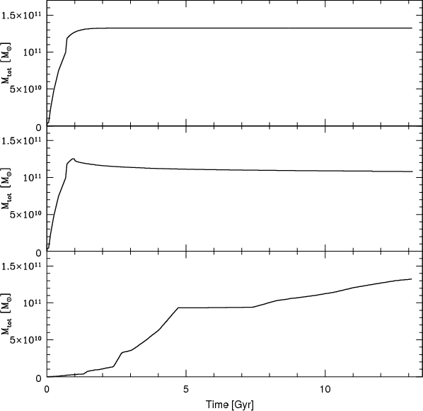 In Fig. 2 we give the total mass of all the models as a function of time. The mass of Model 1 increases during the first Gyr of formation, remaining constant when the infall law rapidly decreases. Model 2 shows the same behavior during the first Gyr, whereas it slightly decreases after 1 Gyr, since the wind starts and part of the gas is ejected. The mass accretion history of Model 3, instead, is very different from those of Model 1 and 2. It increases very slowly until