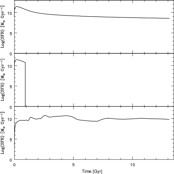 Figure 3: The star formation rate (SFR) vs. time for the three models. Upper panel: Model 1; Middle panel: Model 2; Bottom panel: Model 3. |