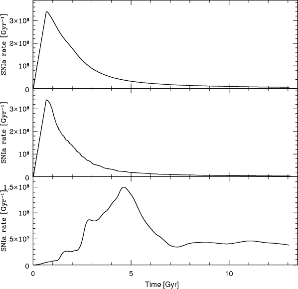 Figure 4: The SNIa rate vs. time for the three models. Upper panel: Model 1; Middle panel: Model 2; Bottom panel: Model 3. |
