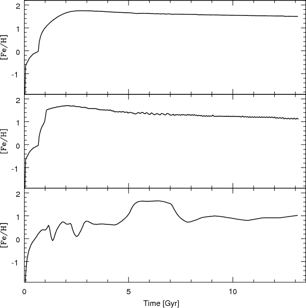 Figure 5: [Fe/H] vs. time for the three models. Upper panel: Model 1; Middle panel: Model 2; Bottom panel: Model 3. |