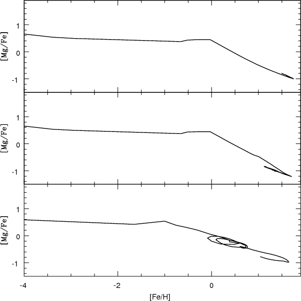 In Fig. 6 we plot the [Mg/Fe] as a function of [Fe/H]. All three models initially have the same behavior. However the [Mg/Fe] of Model 3 starts to decrease at lower metallicities than in Models 1 and 2. In Model 3 the changing in slope happens at [Fe/H]