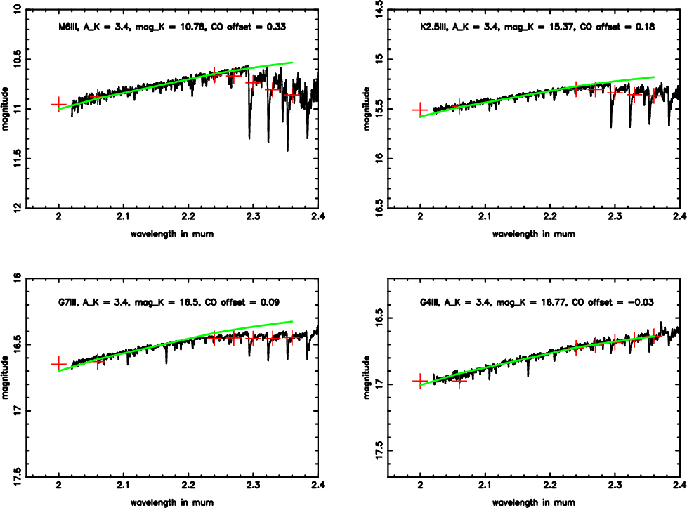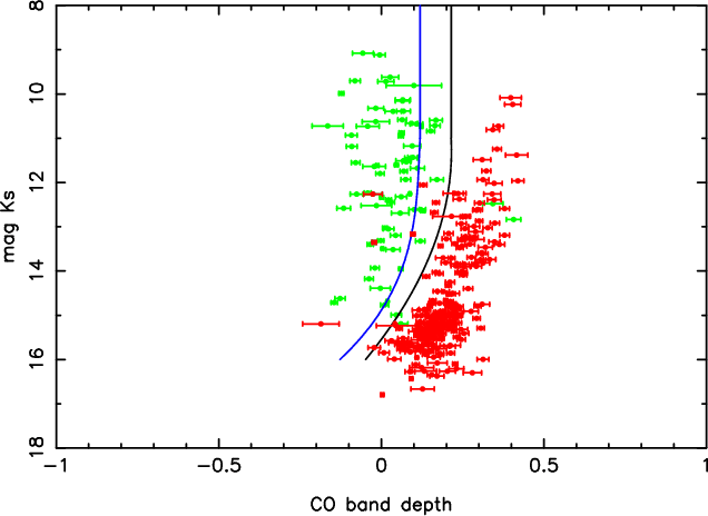 Methods. We use AO assisted observations obtained at the ESO VLT in the NIR H-band and 7 intermediate bands covering the NIR K-band. A comparison of the resulting SEDs with a blackbody of variable extinction then allows us to determine the presence and strength of a CO absorption feature to distinguish between early and late type stars.