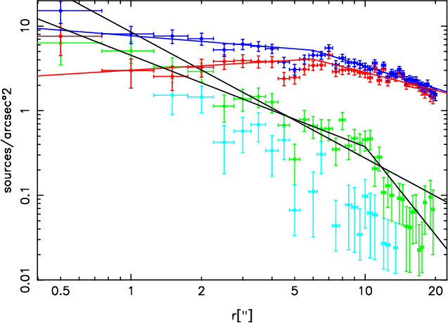 We also detect early type candidates outside of 0.5 pc in significant numbers for the first time. The late type density function shows an inversion in the inner 6