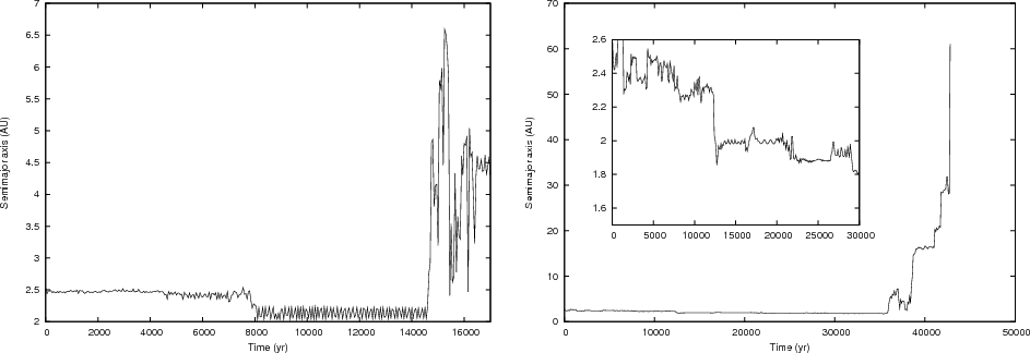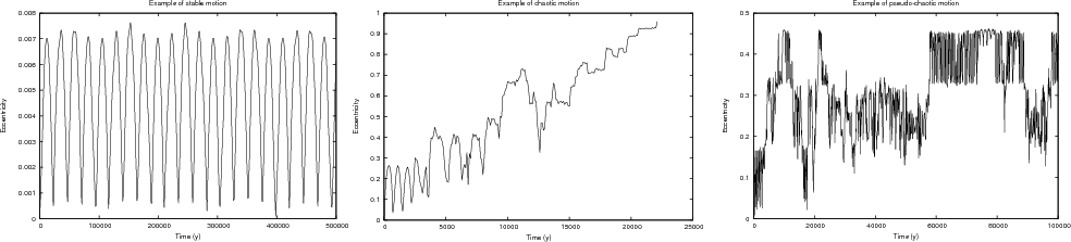 - Mildly unstable: the bodies jump chaotically between different resonant states because of resonance overlap, but remain in the belt for an extended period of time. As the planetary eccentricity increases, this behaviour is more frequently only transient, followed by a final ejection of the particle, as shown in Fig. 3. A reliable identification of the regions strongly influenced by resonances requires a longer integration time and a more systematic exploration of the initial conditions. We discuss this point in the next section.