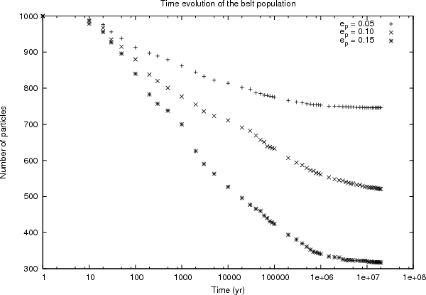 The number of bodies in the belt surviving as long as 20 Myr is shown