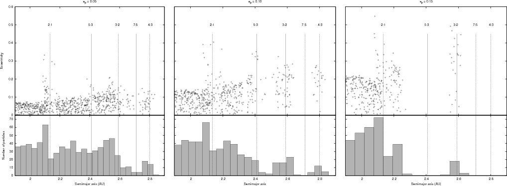 Figure 5: Eccentricities and semimajor axes of the belt particles after 20 Myr of dynamical integration. The vertical lines indicate the position of the most relevant resonances. In the lower plots, we represent the corresponding histograms. |