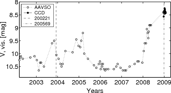 - We obtained the visual photometry from the American Association of Variable Star Observers (AAVSO) at http://www.aavso.org